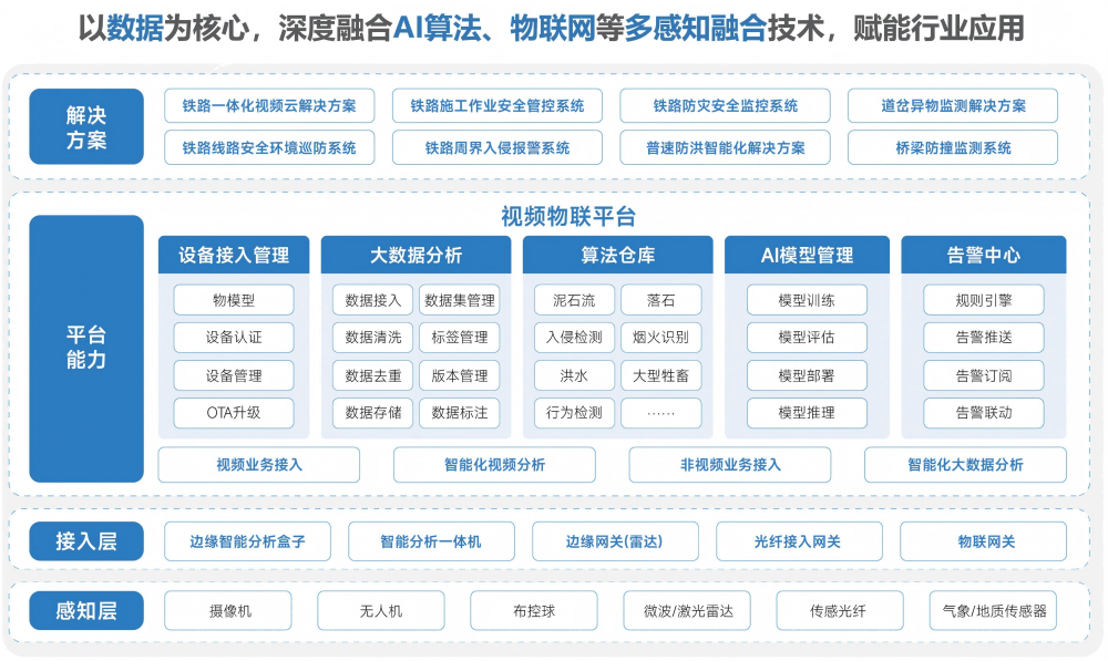 平台顺利获得海量铁路场景数据积累与算法优化,沉淀了人员行为、设备状态、环境安全等50余类铁路专用算法模型,形成行业AI技术资产库,为铁路专用AI大模型给予训练基础与场景验证支撑。